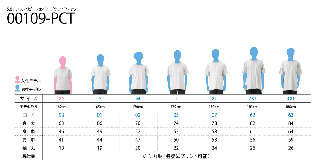 | 脇仕様 | 丸胴(脇腹にプリント可能) | 丸胴(脇腹にプリント可能) | 丸胴(脇腹にプリント可能) | 丸胴(脇腹にプリント可能) | 丸胴(脇腹にプリント可能) | 丸胴(脇腹にプリント可能) | 丸胴(脇腹にプリント可能) |
